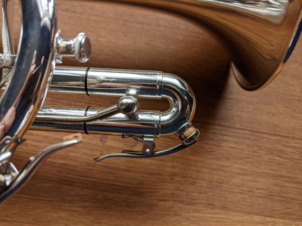 The Heritage has triggers on the first and third slide and these are connected using ball and socket joints. This means you don’t need a screwdriver to take them off for cleaning, they just pop off. The valve buttons are made from silver plated metal and remind me of the ones used on some of the French Besson trumpets. If you have never played on plated buttons they are actually quite grippy and works as well as mother of pearl. There is a lyre box for marching, which some top end makers don’t fit to their cornets.