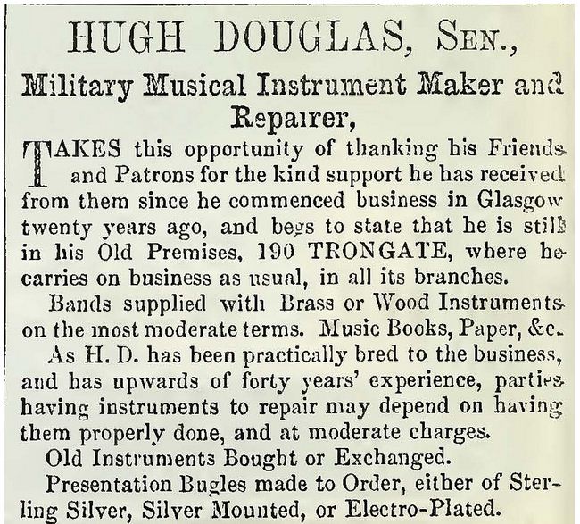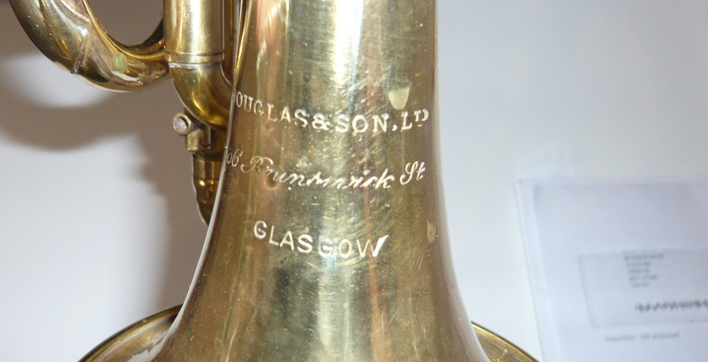 Its not clear if Douglas & Son made brass instruments themselves or just marketed other peoples. His premises were rather small and although that does not preclude manufacturing of small instruments, manufacturing the full range of larger instruments he sold would have been difficult. At the time of Hugh D Douglas’ death in 1887 he was selling instruments made by Thibouville Lamy of France (according to his will which lists a debt to that company), but he also owed a debt to an electro plating company in Glasgow so he must have been repairing or manufacturing something.