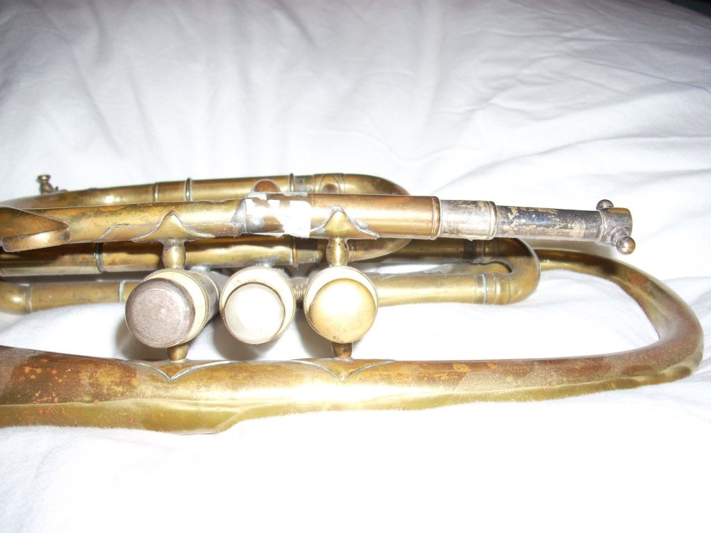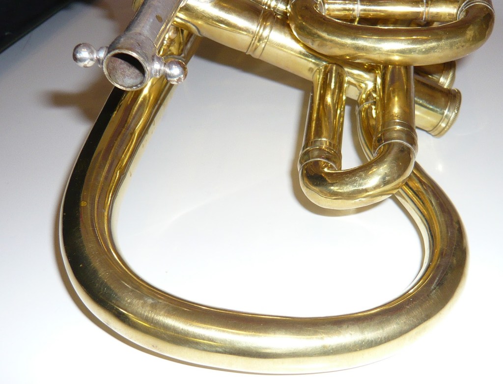 My interest in Douglas and Son started when I acquired a cornet with the company name engraved on it several years ago. I had never seen an instrument with a Scottish maker’s mark so I had it restored to a playable condition. The bell is engraved Douglas & Son Ltd, 66 Brunswick St, Glasgow. It is a high pitch cornet that has been converted to low pitch at some point. I originally thought it was made in the 1880’s but my research into the company name show it is probably post 1908 although the style is earlier. Here are some photographs from before and after the rebuild: