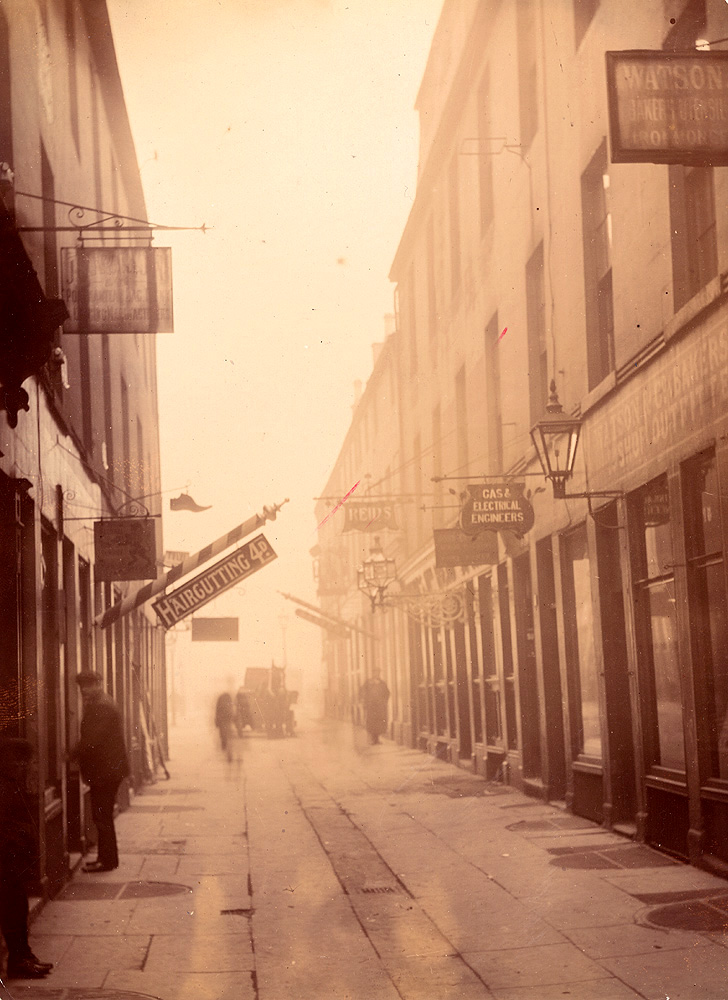 A shop sign carrying a representation of a bugle and other musical instruments is just visible in the distance: