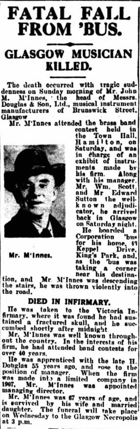 The business was bought by his former apprentice and employee John McInnes. Sadly, he died after falling from a bus on his way home from running a trade stand at the Scottish Brass Band Championships in Hamilton in 1931 (Daily Record 26th October 1931):