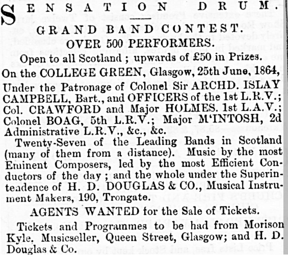Notice of a band contest in Glasgow Green on 25th June 1864, sponsored by H D Douglas & Co with £50 of prizes (Glasgow Courier 25th May 1864):