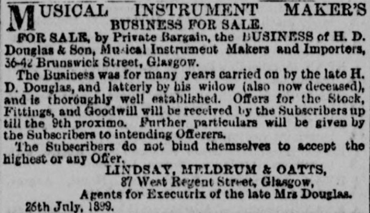 Both were too young to have inherited the business on their father’s death, but the business was continued on by his wife until her death in 1899. John Gray Douglas is listed in the 1881 census as a “music seller” so it seems that he is likely to be the “& Son”.
