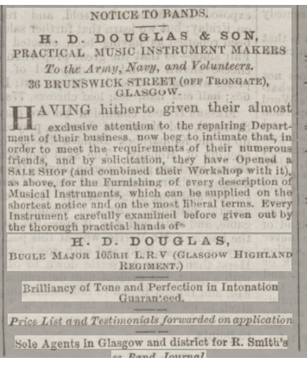 Douglas seems to have been something of an entrepreneur and saw the potential for the new brass instruments to supplant woodwind instruments in civilian bands as a money making opportunity. In 1862 he organised and sponsored the first brass band contest in Scotland (known as H D Douglas’ Contest) with a series of further competitions in 1864 and 1865. The top prize was £77 – equivalent to £1600 in today’s money.