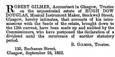 However, later in 1862 something appears to have gone wrong and he was in debt with his assets subject to sequestration (notice from the Edinburgh Gazette):